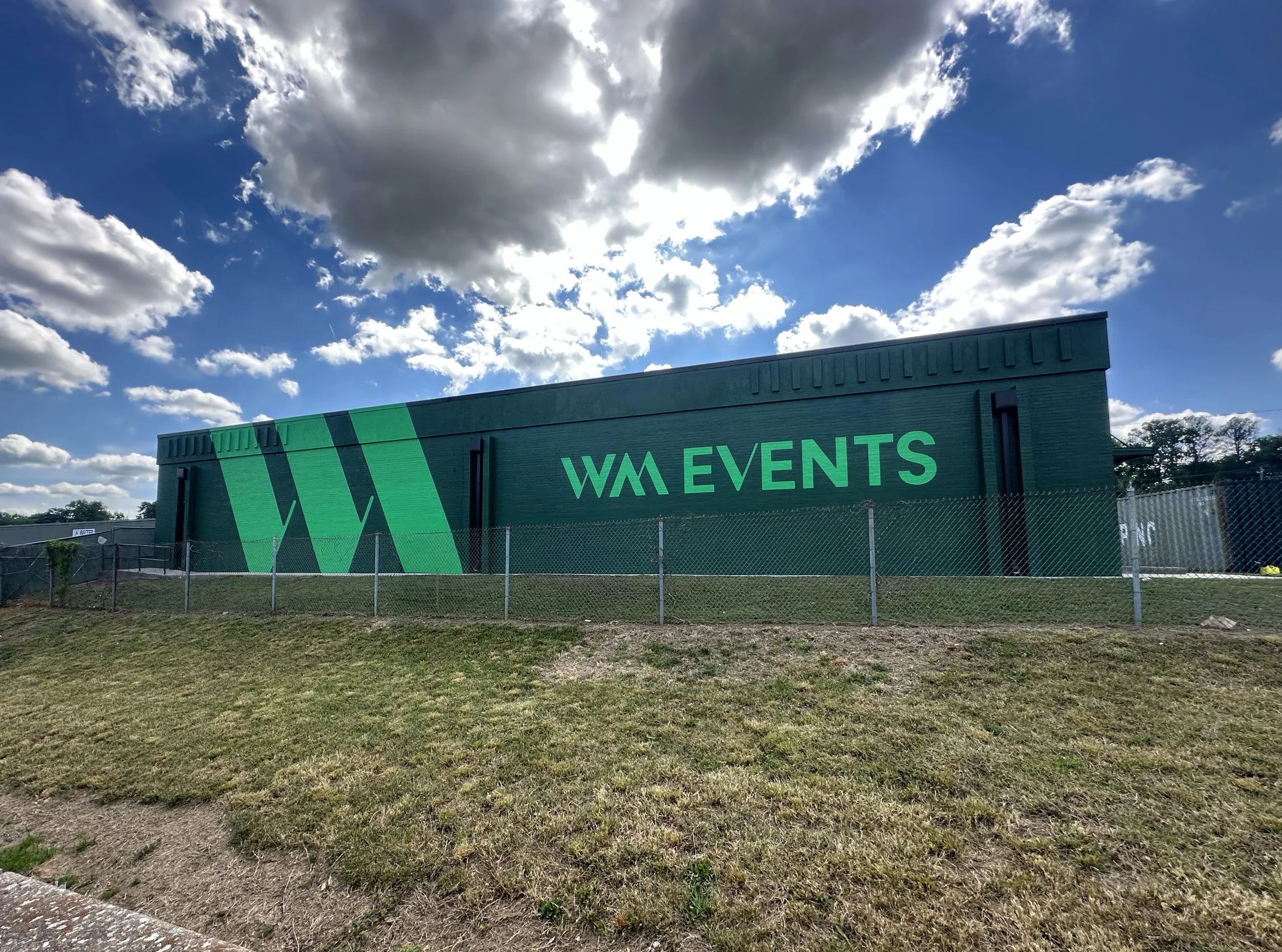 Murals and signage wrapping the building on 4 unique wall. Lines were methodically planned and hand painted for WM Events signature confetti design.